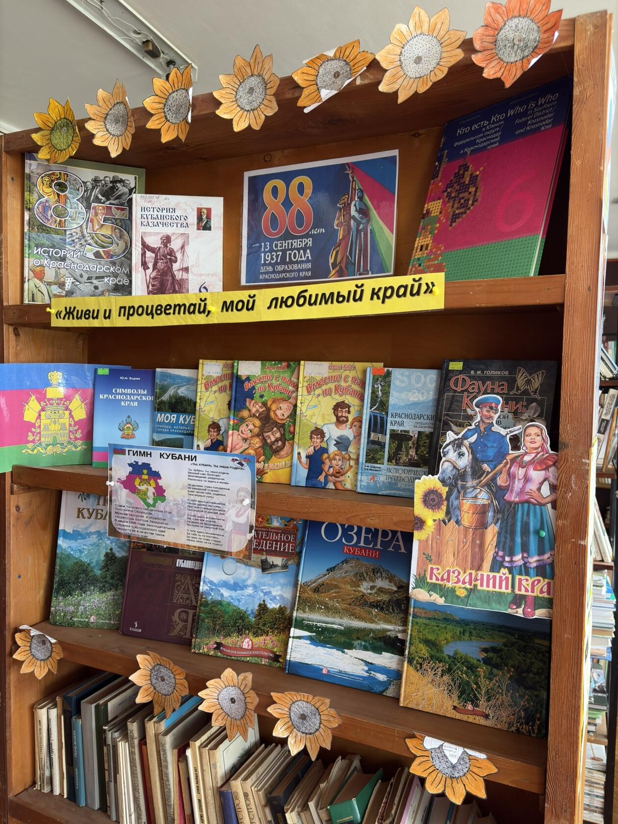У каждого на свете есть любимый уголок земли. Этот уголок называют малой родиной. Наша малая родина – Кубань, чудесный, благодатный край. Край снежных гор и золотых хлебных полей, привольных степей и цветущих садов. Край, в котором живут замечательные люди. В честь празднования 88-летия со дня образования Краснодарского края в Кулешовской библиотеке филиал № 2 оформлена книжная выставка «Живи и процветай, мой любимый край».
